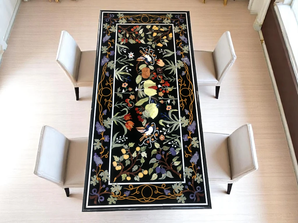 Experience opulence with our Luxury Dining Table, featuring a stunning black marble top adorned with exquisite semi-precious pietradura art. A masterpiece of craftsmanship, this table seamlessly combines timeless elegance with intricate decorative artistry, perfect for sophisticated interiors.