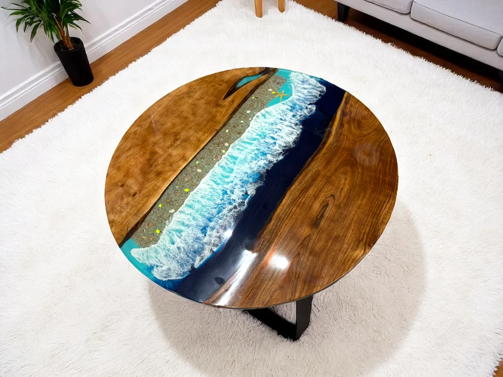 The epoxy resin is carefully poured and crafted into the design — whether it's a flowing river, ocean effect, or other artistic styles.